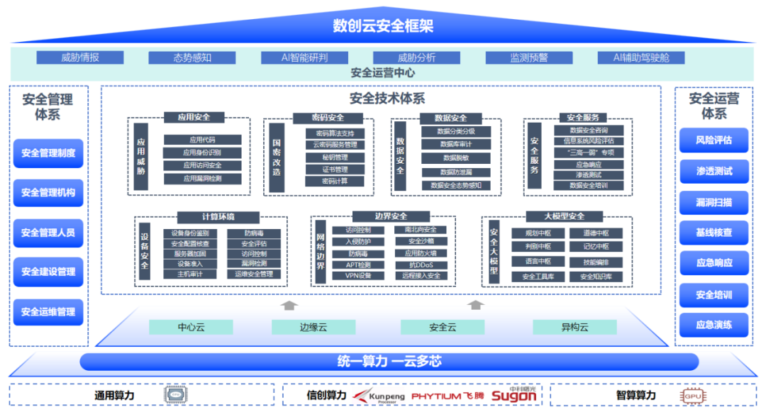 聚焦上云客户业务系统数字化转型赋能,数创云安全体系基于“一云多芯”的底层算力之上,技术体系层面涵盖计算环境安全、边界安全、应用安全、数据安全、密码安全、大模型安全等能力范围。通过统一安全运营中心支撑运营工作,保障云上业务系统数据安全。