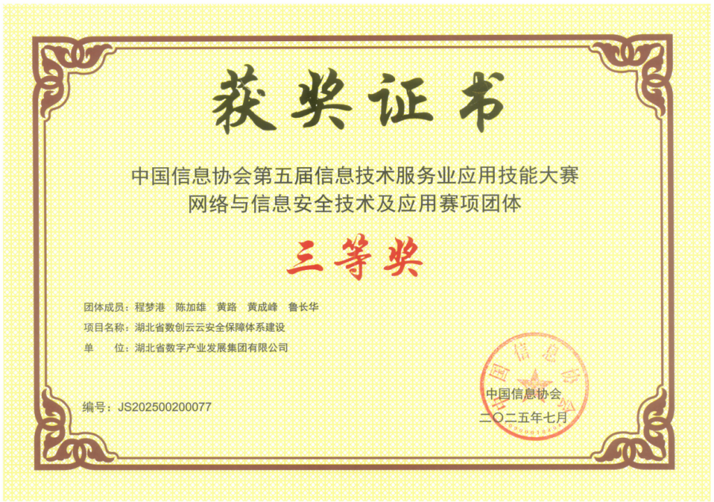 在中国信息协会第五届信息技术服务业应用技能大赛网络与信息安全技术及应用赛项中,联投数产集团申报的“湖北省数创云云安全保障体系建设项目”获团体三等奖,彰显了湖北数创云平台整体安全体系建设的显著成效。